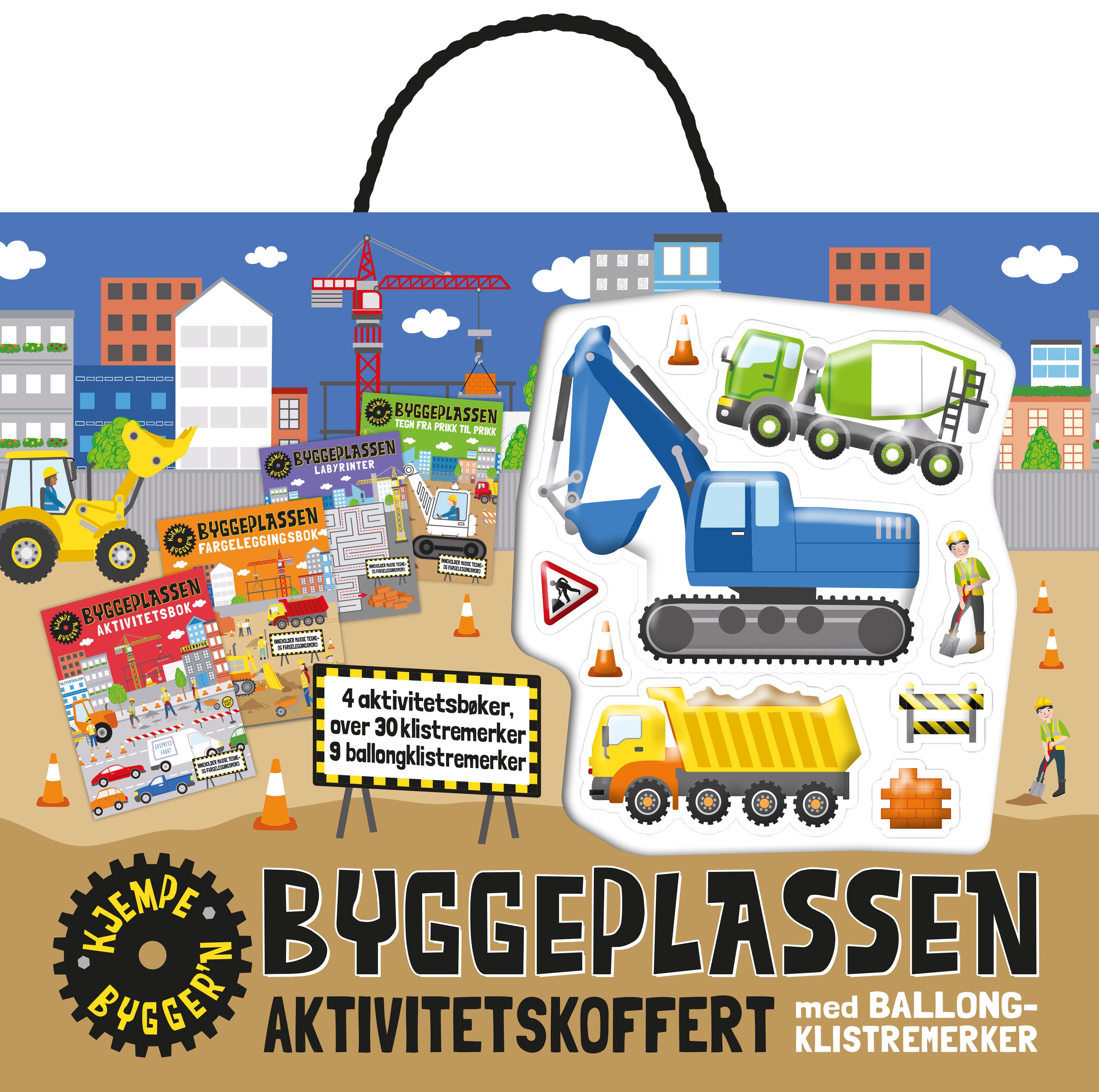I kofferten med byggeplass som tema, finner du fire fargerike aktivitetsbøker som er fulle av oppgaver, ordleker, labyrinter og mye mer. I tillegg følger det med over 30 klistremerker og 9 stilige ballongklistremerker.