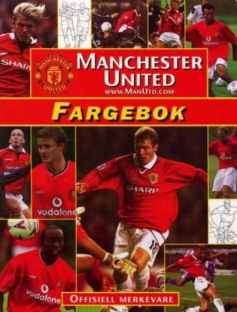 Boka inneholder en samling actionbilder med spillere fra Manchester United, og på motsatt side er det samme bildet streket opp slik at du kan fargelegge det.