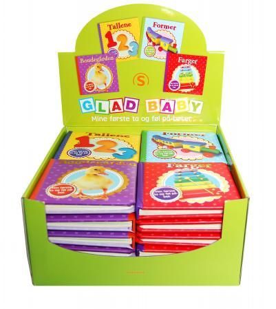 Glad baby. Eske med ta og føl-på bøker. 6x4 titler á 49.-