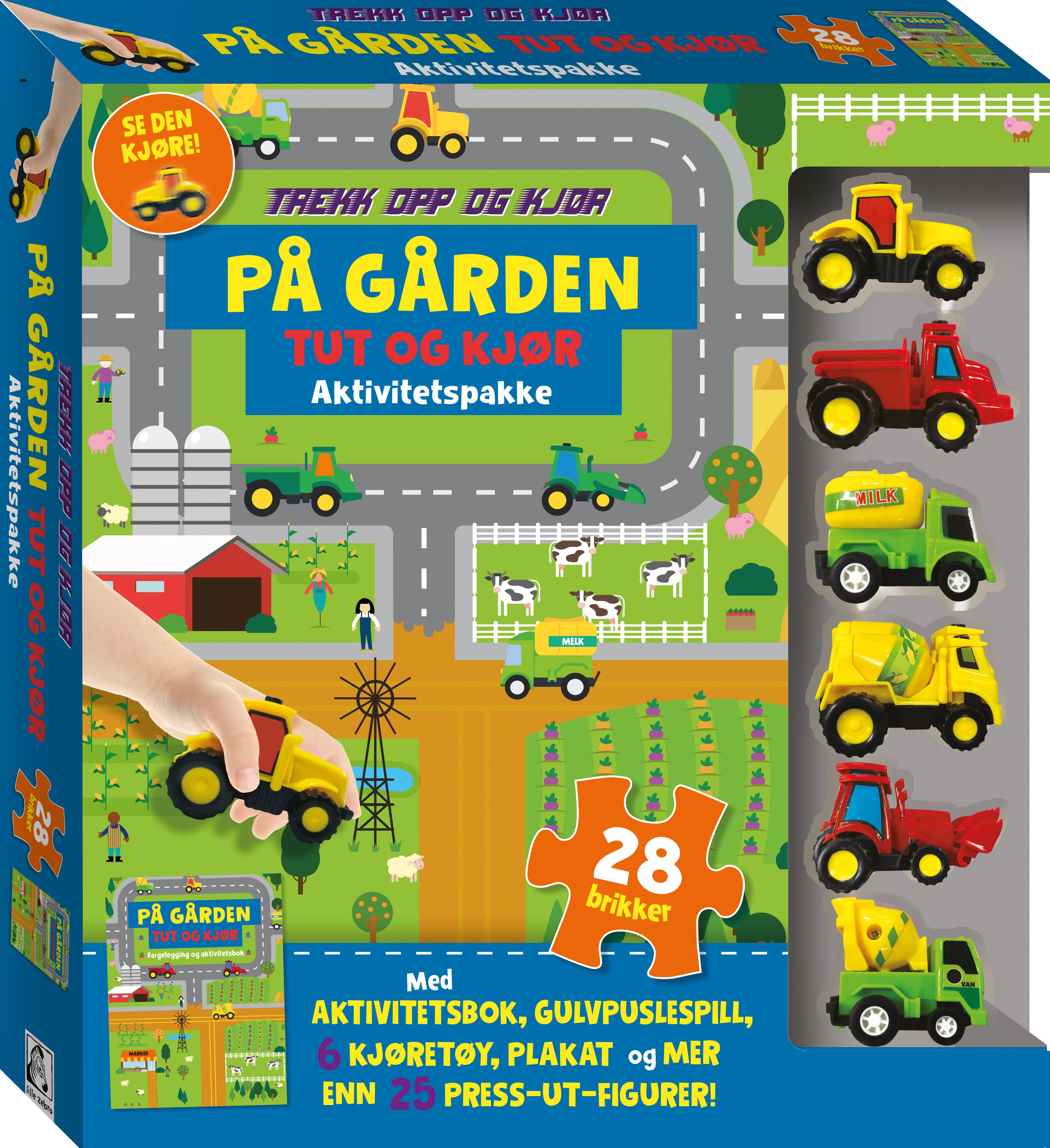 Med denne innholdsrike aktivitetspakken får dere mange timer med moro. Sett sammen det store 28 brikkers puslespillet av gården til du får en stor lekematte (42 x61 cm). Press ut alle figurene av folk, dyr, redskaper og avlinger og plasser dem rundt på gården, så det blir liv og røre. Trekk opp de ulike arbeidskjøretøyene og la dem kjøre rundt på gården. Etterpå kan du bruke den 32-siders aktivitetsboken, fargelegge og løse spennende oppgaver og lese om livet på gården.