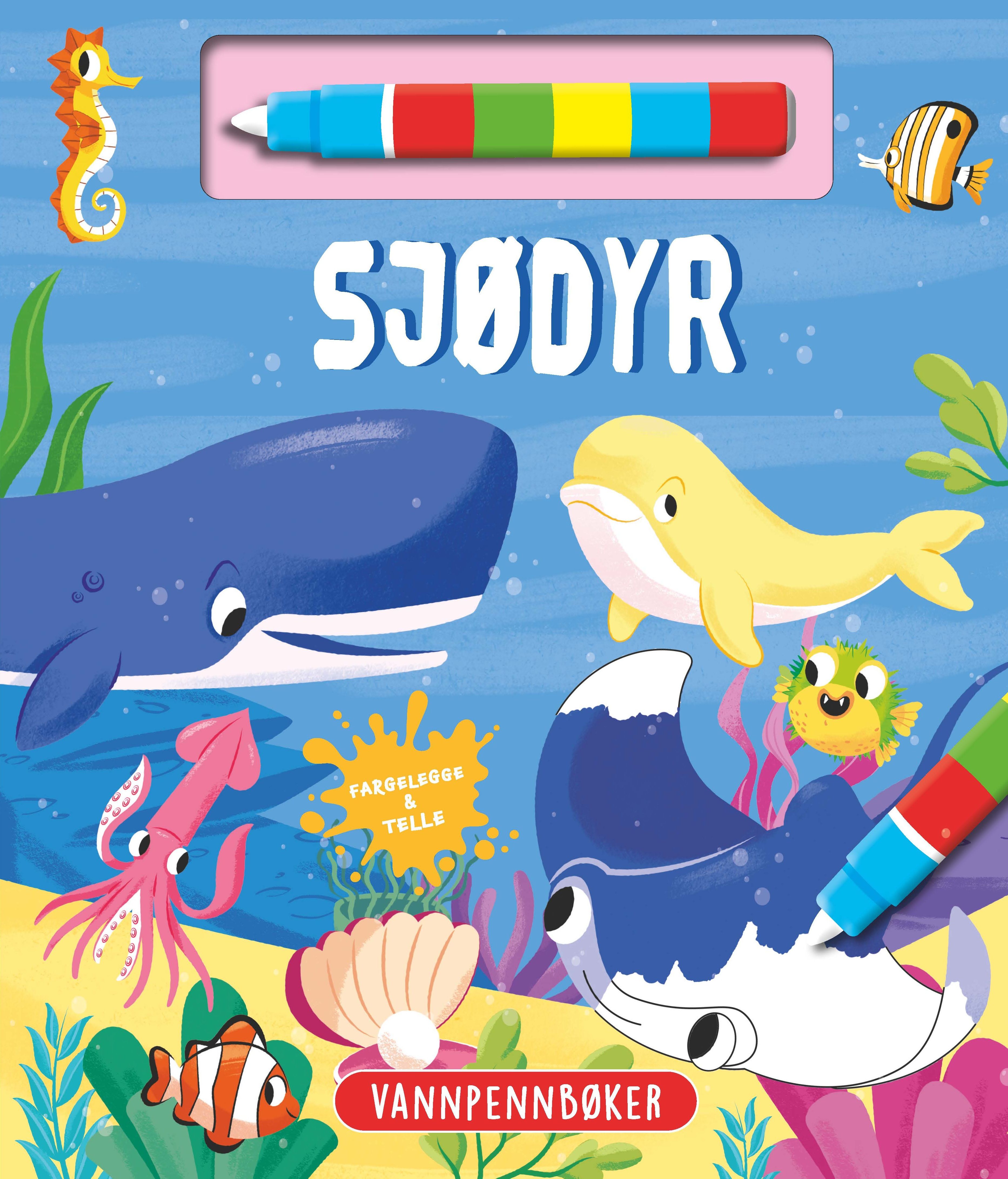 Vannfargepenn SJØDYR Fargelegge & TellebokenlFYLL PENSELEN MED VANN OG BEGYNN Å MALE TEGNINGENE I BOKEN. HA DET GØY VED Å LEKE OG TELLE MED SJØDYR SOM ER PÅ HVER SIDE. DET ER ENKELT OG MORSOMT! FORLAT BOKEN MED SIDEN ÅPEN FOR Å TØRKE. DU VIL SE HVORDAN FARGENE FORSVINNER OG DU KAN MALE IGJEN SÅ MANGE GANGER DU VIL! BØKENE ER PÅ 12 SIDER. A4 FORMAT. INNBUNDET I STIV PAPP