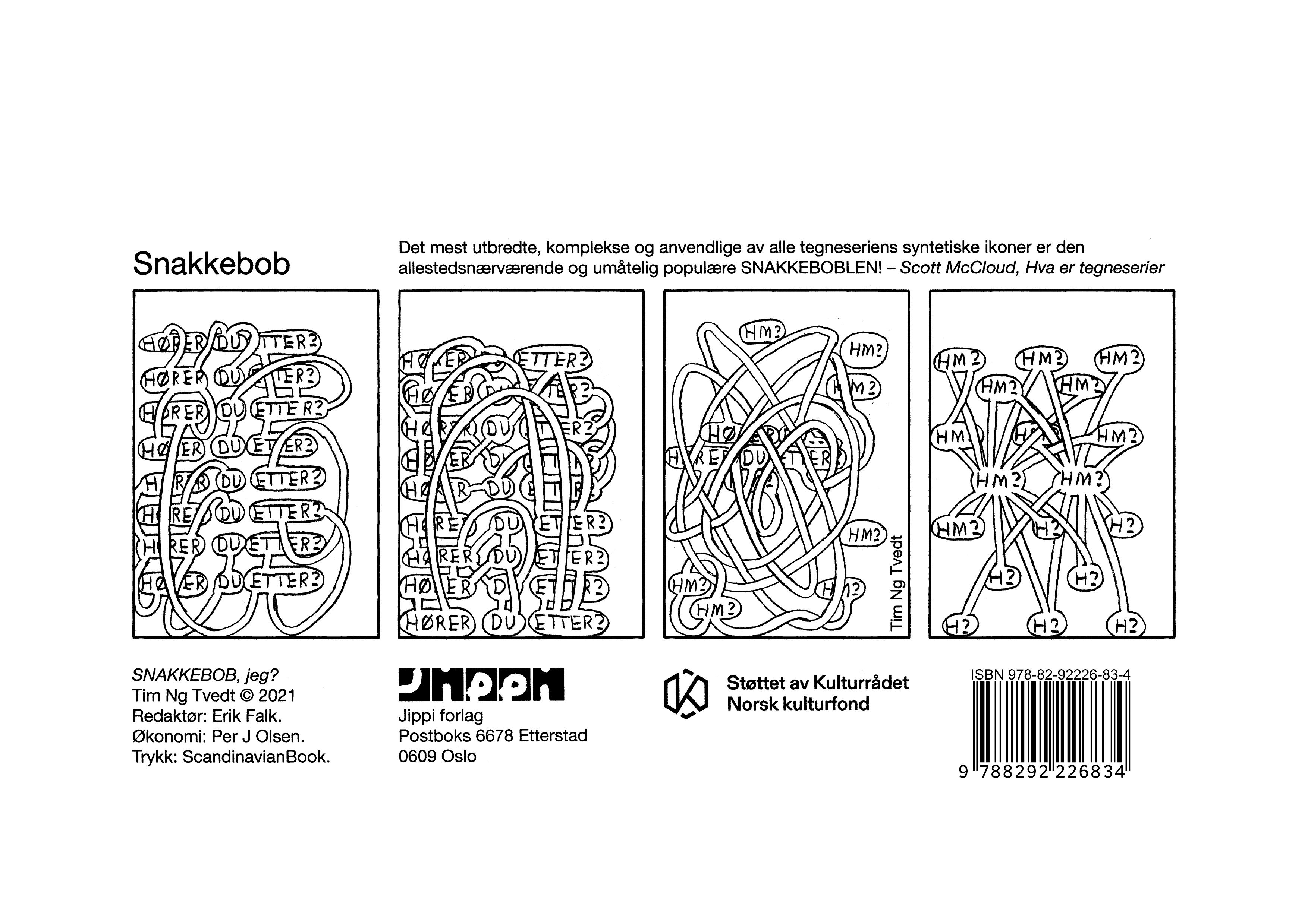 Snakkebob, jeg? er en stripesamling med helt nye striper fra tegneserien SNAKKEBOB. av Tim Ng Tvedt. Tim Ng Tvedt har tidligere utgitt flere tegneserier på Jippi forlag, men først med SNAKKEBOB. har han funnet sin stemme i tegneserienorge. Sier han selv.